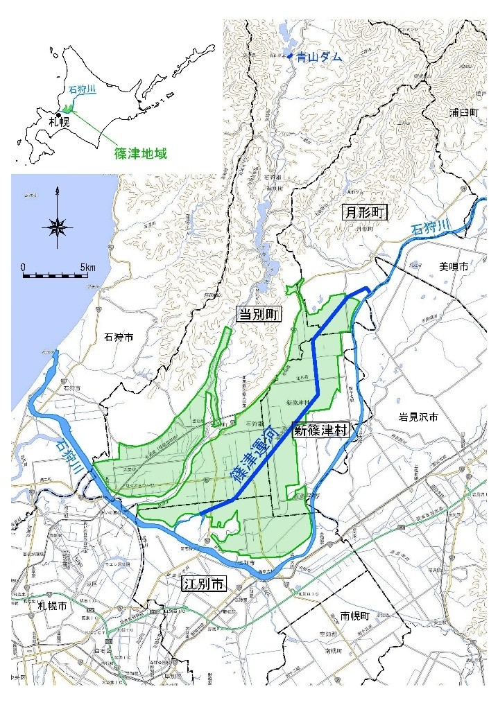 篠津地域は、石狩平野の南部、石狩川右岸(北岸)に位置し、当別町、新篠津村、江別市、月形町(受益面積順)から成る。札幌市中心部からでは、北東へおよそ20kmから40kmまでのところに広がっている(ちなみに新千歳空港から札幌駅までの距離が約45km)。