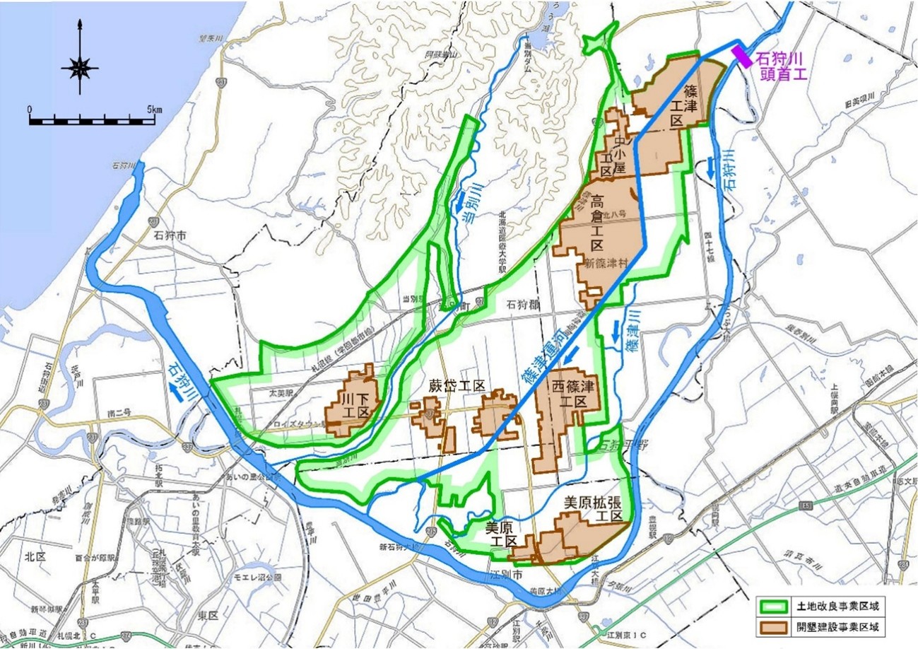 かんがい区域は、石狩川から頭首工(石狩川頭首工(昭和38年(1963年)完成))で取水し用排兼用の篠津運河を経由して導水する区域(篠津中央地区)、石狩川から直接揚水する区域(南美原地区)、当別川上流にダム(青山ダム)を築造して用水供給を受ける区域(当別地区) の3つから成る。