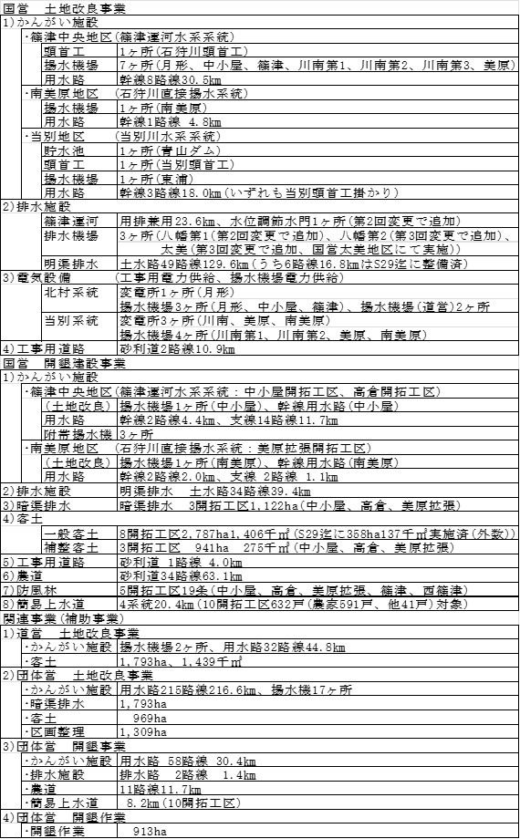 篠津地域泥炭地開発事業は、前述のとおり、かんがい排水事業と開墾建設事業とを併せ行う総合事業であり、国営で実施する部分と関連の補助事業(道営、団体営)で実施する部分から成る。また、国営、補助の各事業は、それぞれ既耕地を対象とする土地改良事業と未墾地を対象とする開墾建設事業に分けられる。全体の受益面積は11,398.2ha(最終の計画変更(第3回、昭和43年(1968年))時点)である。