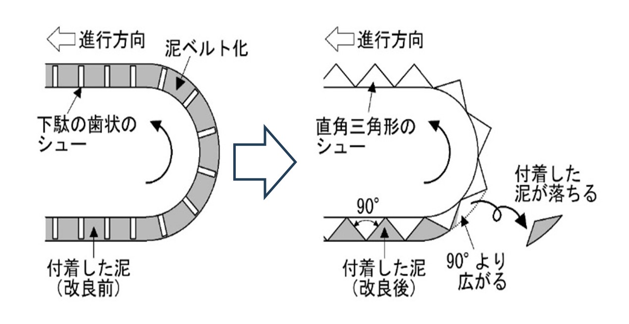 昭和27年(1952年)に研究に着手し、苦心の末、昭和29年(1954年)になって改良に成功した。履帯の板面の突起(シュー)を、下駄の歯のように板状に突き出たものから直角三角形の形状に変更したのである。この変更で、泥が面的に圧着して踏み固められるようになって泥が板面に粘着しにくくなり、また付着した泥も履帯が下方から上方に巻き取られる際に直角三角形の90°の突起に挟まれた空間が鈍角に広がることにより剥がれ落ちるようになった。また、線的ではなく面的に踏み固められることで泥炭の繊維が切断されずに残るため、その繊維に支えられて、車体がヘドロの中に沈み込むようなこともなくなった。さらに、直角三角形のシューで面的に締め固められた泥を押し出すと水平方向の反力が得られ、前方にも容易に進むことができるようになった。シューの側面が広がりを持った形状になったため、横滑りも抑えられるようになった。