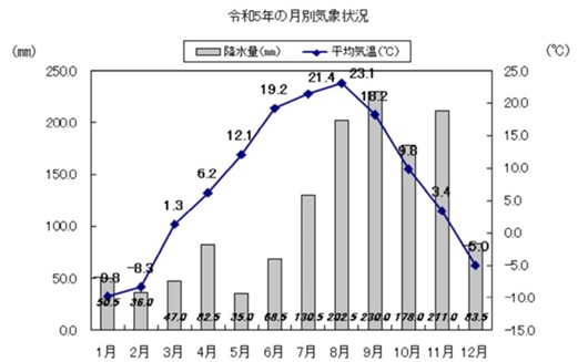 気候は、四方を山々に囲まれた盆地特有の四季の変化がはっきりした内陸性気候で、冬季と夏季の寒暖差がきわめて大きく60℃にもなり、特に冬は北海道でも寒さが厳しい地域である。さらにその上、特別豪雪地帯*に指定されている地域である。