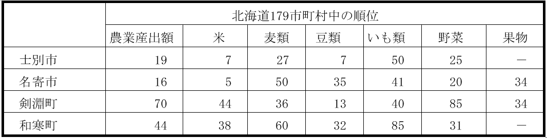 また、当地域で、野菜の順位が高い傾向にあるが、野菜の中でも、カボチャの生産量は、全国でもトップクラスとなっている(カボチャの生産額全国ランキング:和寒町1位、名寄市2位、士別市7位)。