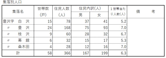 豊沢地内で水没対象となった集落は、豊沢地内豊沢川下流より白沢、豊沢、桂沢は豊沢川の右岸に、幕舘は左岸にあり、4集落の全戸数54戸(338人)が水没対象となった。但し、字桑木田に点在した4戸(28人)は、水没対象の4集落の住民と親戚関係にあり、4集落の54戸全て移転したため生計を維持する上で不安定となるため、間接移転を余儀なくされ、ここに旧集落民58戸366人全てが移転する事となった。