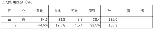 周辺の山林はその大部分が国有林又は牧野組合の原野、共有地等で利用されており、個人の所有地としては集落の近傍地に若干あるのみである。なお、部落近傍林は主に薪炭用材に利用され、家計の重要な資金源となっていた。