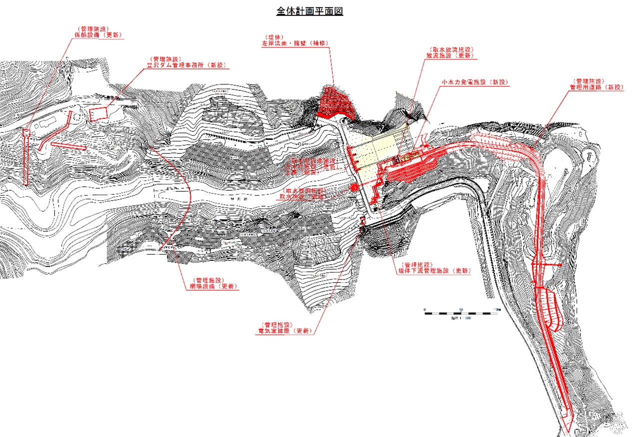 って、昭和30年に国営事業計画を変更する事となり、旧田補水量、開田所要量を詳細に調査した結果、開田面積が648ha増加し1,024ha、ダムの貯水量は2,335万m3でダムの貯水位が3m高くなり、昭和31年12月6日付けで計画変更が認証され。その後、工事は年平均25,000m3のコンクリート打設を実施し、昭和35年度に本体コンクリートの打設並びにダム付帯機器一切の取付工事を完了した。