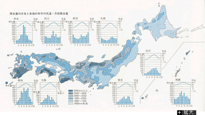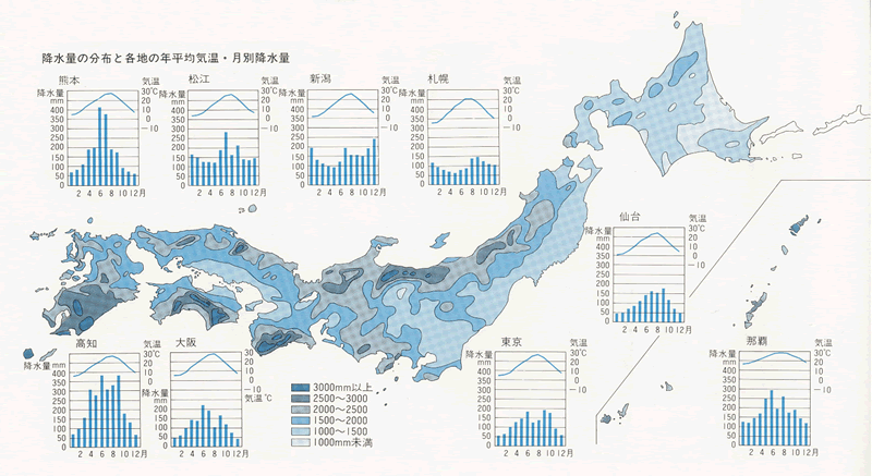 降水量は、年間平均1,800mmで、世界平均の2倍以上であり、熱帯に匹敵する。降水量の分布は地域的な変化が大きく、3,000mm以上の多雨域は九州南部、四国南部、紀伊半島南東部、中越・北越内陸部などにみられる。一方、1,200mm以下の少雨域は北海道、東北地方太平洋側、中部地方内陸部、瀬戸内海沿岸部などにみられる。梅雨期と秋雨期に降水量が多いが、日本海側ではこの時期のほかに冬(おもに雪)にも降水量が多い。太平洋側は冬は渇水期となる。