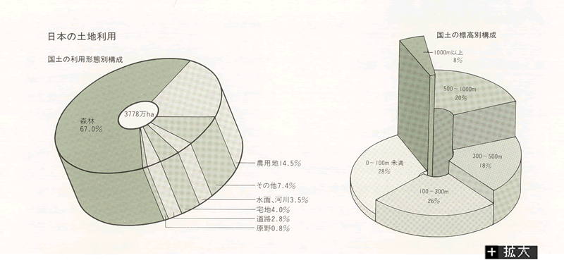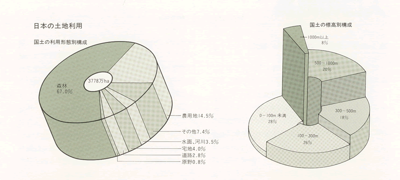 日本の国土の面積は、約3,778万haであり、その大部分は山地が占め、北海道から九州・沖縄までの山地の大部分は、緑におおわれ、森林面積は国土の3分の2に達する。その割合は、世界平均の31%を大きく上回っているが、人口1人当たりの面積でみると、世界平均の約4分の1のO.21haにすぎない。