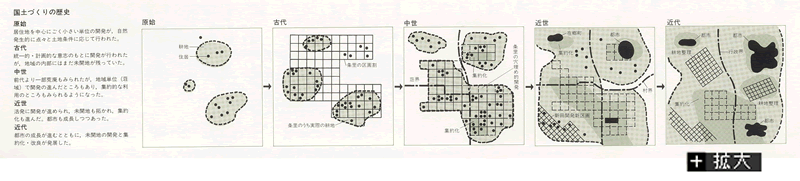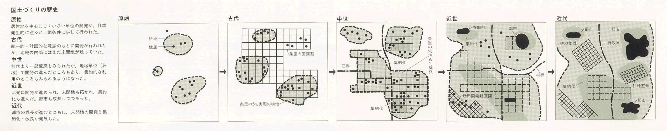 地域的な開発とよべるような開発の形態が出現したのは、条里制の施行を先駆とする。その後、中世の荘園開発、現代にも通じるところのある新田開発と、一定の領域全体を対象とした開発が出現し、近代に至る。もちろん小規模で自然発生的な開発も常に絶ゆみなく続けられた。それらが積み重なって、現代の我々がみることのできる多様で有機的なつながりをもった国土が形成されたのである。