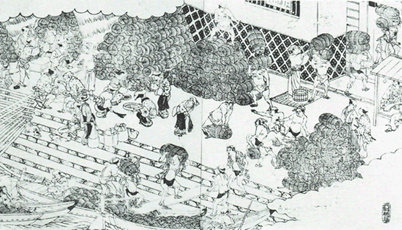 諸国から船で運ばれてきた米俵が積まれている。(『日本山海名物図会』より)