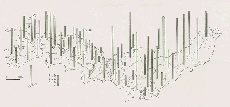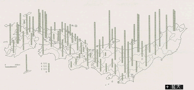(注)旧陸奥国から分かれた、陸奥、磐城、岩代、陸前、陸中の5国については、正保のデータが不十分なため、その後の元禄郷帳のデータで計算した。そのため、実際はこれより更に高い値と思われる。