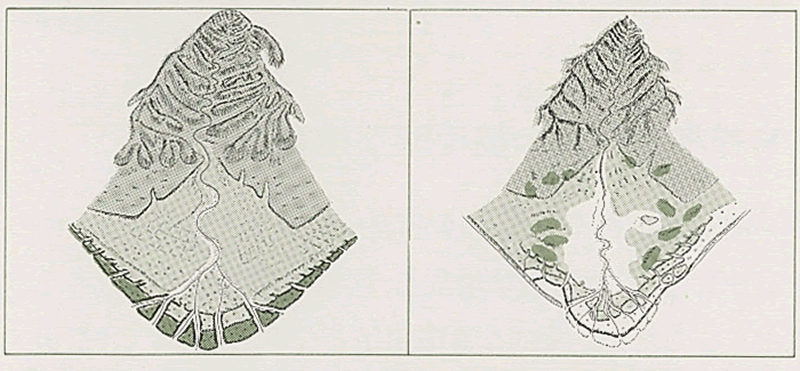 耕地開発進展の模式図 (左)西日本(右)東日本