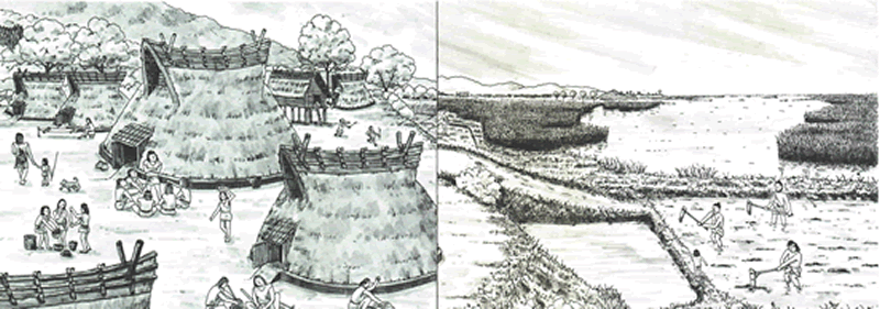 このほか、数百メートル四方もの大集落もみられる。それは共同体の首長が住み地域の中心となる集落で、小集落を周辺に分村しており、地域共同体といえる集落間の結びつきを保っている。分岐小集落のうち高地性のものは、『魏志倭人伝』の「倭国乱」の状況と関連があるとされ、防衛や通信連絡のため、平野部の大集落から派遣された。集落の結びつきは、水路などかんがい組織をも基礎としている。耕作は個別小集落を単位として実施しながら、水路の造成、洪水からの防御、耕地の開発などは、共同労働によってはじめて実現できたのであろう。