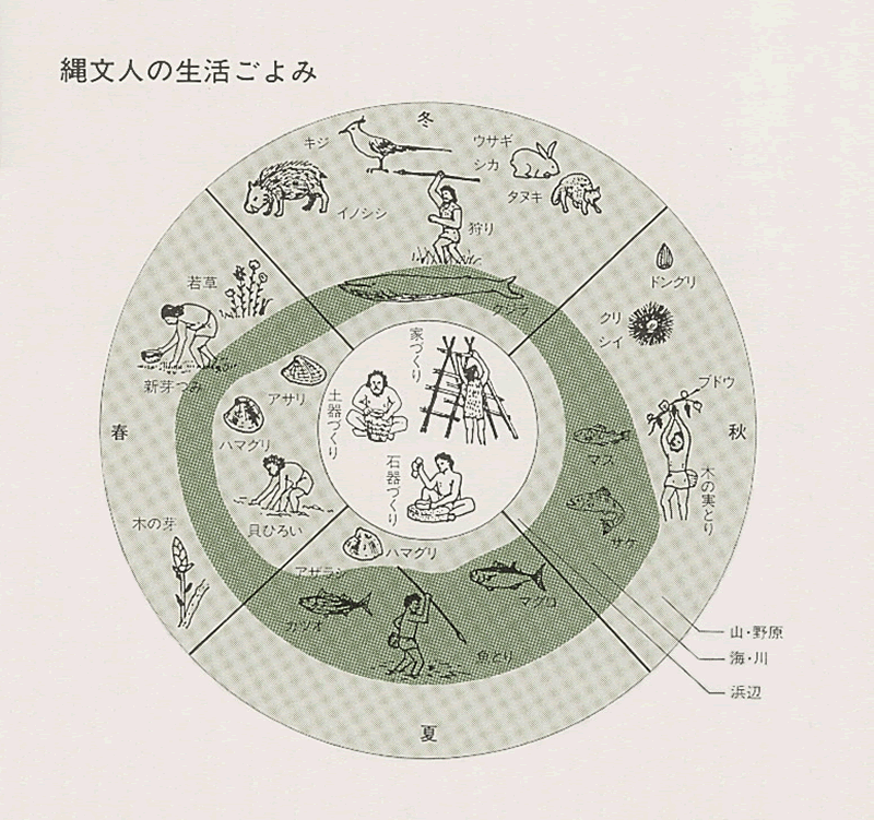 縄文人は、初期には移動生活を送っていたが、以後しだいに定着する。一定地域内に存在する遺跡には、住居跡を伴う定住的集落と、住居跡が発見されず短期間の限定された目的のために利用された活動拠点とがある。複数の定住的集落が、その周囲に転々と活動拠点を残しながら、河川その他の地形的単位によって区切られた一つの地域の中に存在し、それらがある一定期間の後に集落を別の場所に移動させて再び定着する。一つの集落は、4~5戸内外(平均人口30名程度)の竪穴住居が環状に分布する環状集落であった。