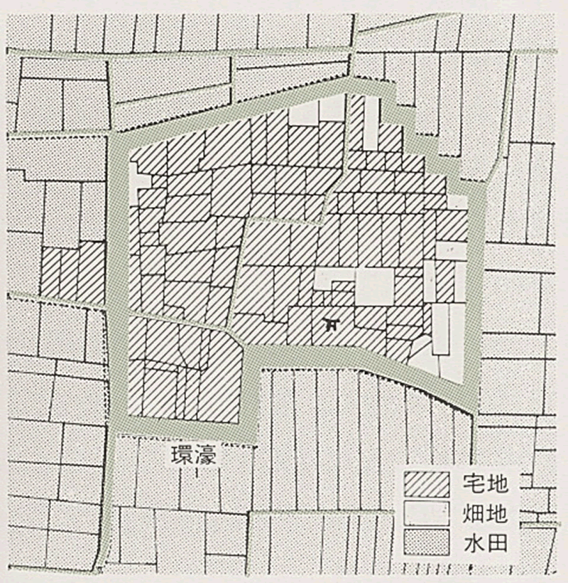畿内および周辺の沖積平野においては、平安末期から室町期までに、屋敷が1か所に集中するようになり、なかには周囲に濠をめぐらせた防御的な色彩の強い環濠集落も出現した。平野全面に広がる条里地割の中でまだまだ不安定であった水田の作付けが安定し、その面積も拡大したのであったが、耕地開発を進めるに際して、水利用の精密化や溜池の築造を行うため、むらの連帯が必要となったのである。また、開発の進展と前後して領主層の荘園に対する支配が強まり、荘域が縮まって荘内ではほぼ均等な名の編成が進んだ。さらには南北朝以後、京を中心とした戦乱に対して自衛の必要が出てきた。こうした一連の動きが、集村化の背景である。
