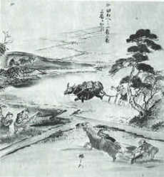 一方、農具の発達はあまりみられなかったのではあるが、和歌や物語によって牛馬耕(犂耕)が登場することが知られる。「すく」という言葉で田の耕起を表わしたもの、「からすき」の語が直接出てくるものがある。かつては、国司・郡司・寺社など貴族や土豪が1人で百に余る鍬や数十頭の牛馬を持っており、農民はかれらの農具で荘園の耕作をさせられていたのであるが、中世には犂耕は荘園農民の手に移り、自らの農具によって耕作し、領主の使役に応じるようになったのであろう。