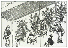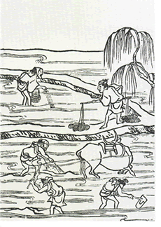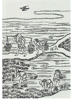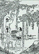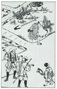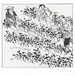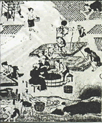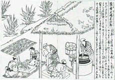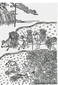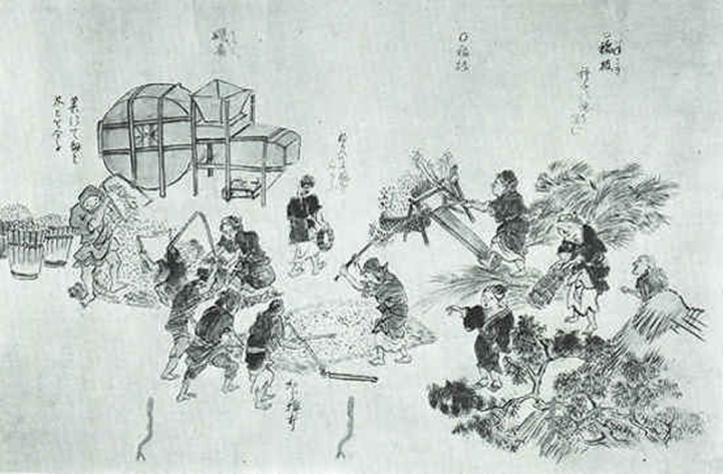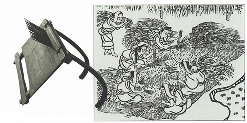 千歯扱 こきはしを使っての脱穀(『農業全書』農事図より)
