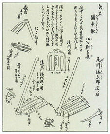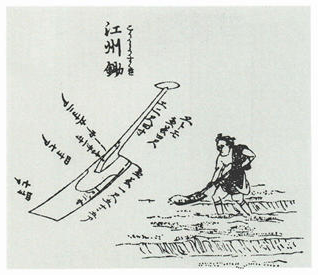 江戸後期、粘質土を耕すため、抵抗が小さく土の付着も少ない刃を又状にした備中鍬が現われ重宝された。