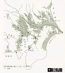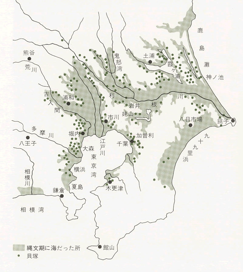 貝塚の分布から、内陸まで海が入り込んでいたことがわかる。