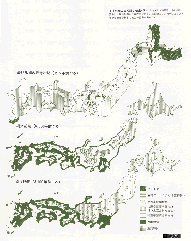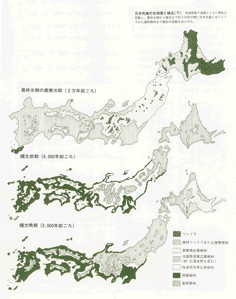 動かない陸地も、気候の変動に応じた海進・海退で拡大・縮小するが、それとともに植生が変化して人々の生活舞台が様変わりする。こうした環境の変化に応じて、人々の土地に対する働きかけも異なってきた。