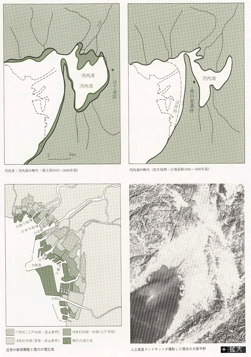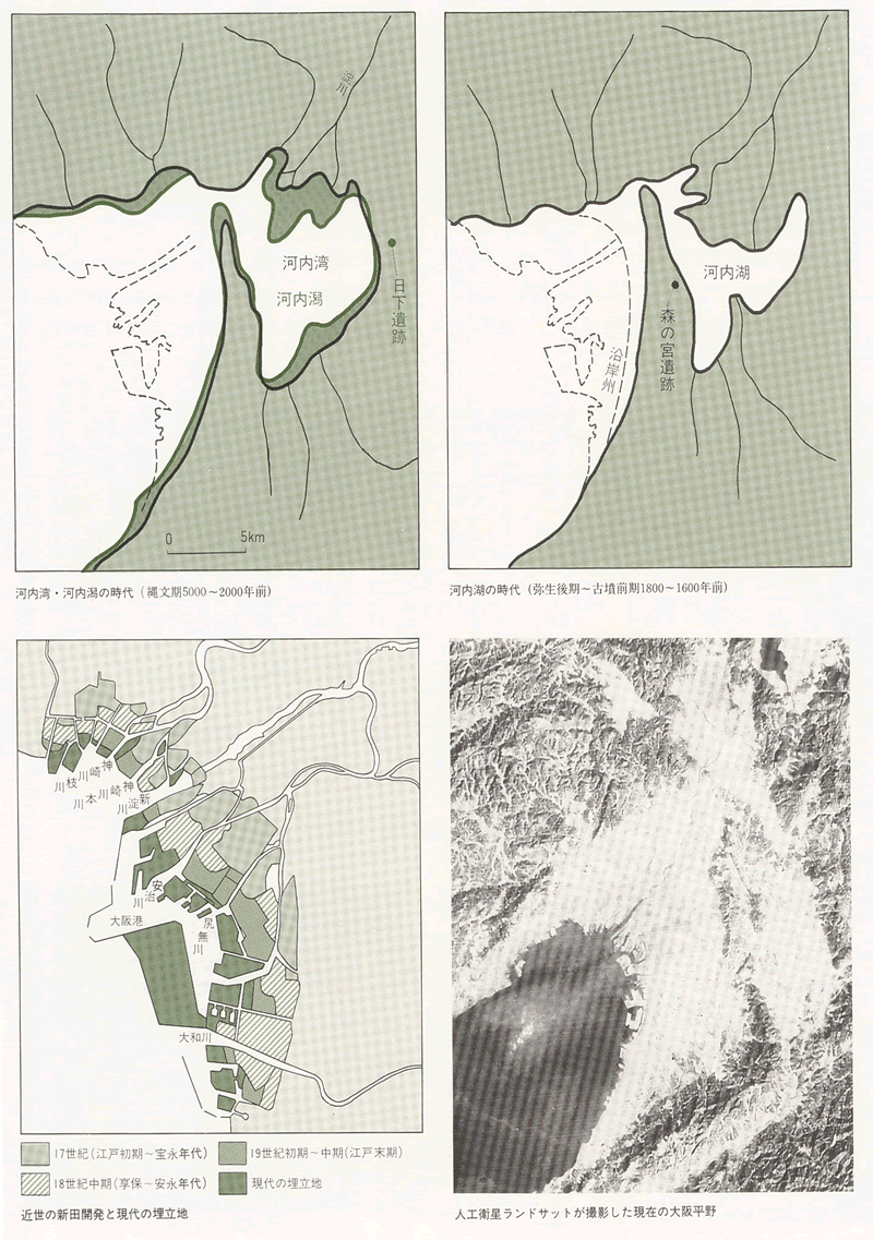 平野は発達する。海面であったところが湾→潟→湖→平野へと長い年月をかけて変化し、陸地が前進する。人間の活動がそれを促進する。わが国で最も古くから開発された大阪平野は、こうした発達の典型例である。生駒山地と半島状に突出した上町台地に囲まれた河内低地、および上町台地西側の現在の都市域(大阪低地)は、自然の堆積作用に加えて、河川の付け替えを含む絶えざる干拓によって形成された新しい平野である。記紀のころからすでに耕地開発が進められ、近世には大々的に新田開発が進められて現在の姿になったその歩みは、わが国の国土形成における見本であるといえよう。