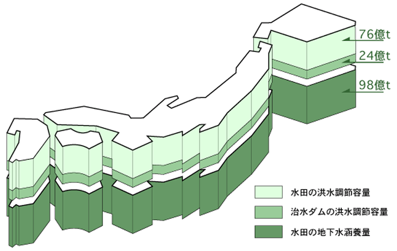 特にわが国の農地の中心的位置を占めてきた水田は、こうした機能を複合的に生み出すすぐれた装置である。水田は大量の降雨を受け止め、使い、蒸発させ、浸みとおらせて自らを保持するのみならず、周辺の都市などをも健全に維持してきた。