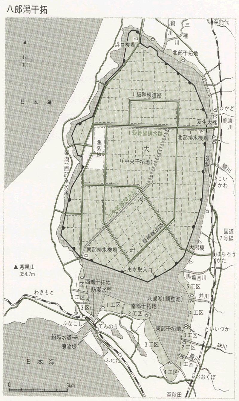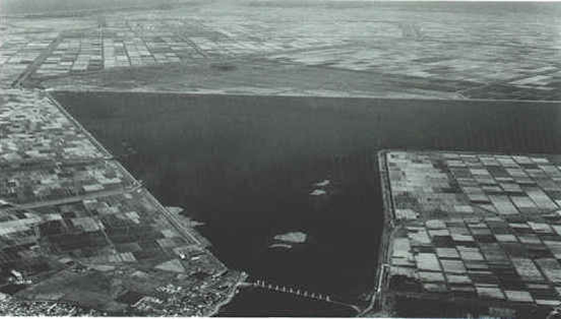 八郎潟(秋田県)の干拓と新農村建設は、戦後の緊迫した食糧事情緩和および農村の次・三男の就業対策を目的に、昭和32(1957)年、国家的要請としてとりあげられ、オランダの技術協力を得てスタートした。「世紀の干拓」といわれたこの事業は、昭和52年に約850億円をかけて完成、中央干拓15,660ha、周辺干拓1,563ha、入植農家580戸のわが国最大の農村建設と、増反による周辺農家の経営改善を図るものであった。干拓規模の大きさだけでなく、世界最高水準を誇る堤防工事をはじめとする干拓地造成と農地整備の技術が高く評価され、さらにはわが国の農村整備技術の嚆矢として評価された。新しい時代の新しい構想による、農村建設の成果であった。