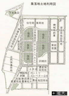 干拓で生まれた大潟村の中心地は、右の図および写真のように計画的な居住区がつくられ、住居と圃場は完全に分離された形となっている。