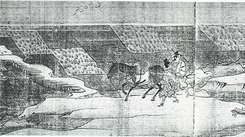 鎌倉後期の絵巻に描かれた休耕田は、「かたあらし」とも呼ばれ、水掛かりや労働力などの制約によって生まれざるを得ないものであった。(歓喜光寺蔵『一遍聖絵』より)