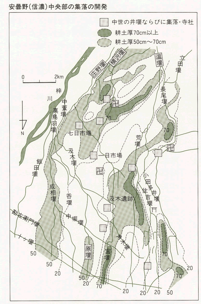 安曇野は、長野県松本盆地の北西部にあり、梓川黒沢川などの河川が形成した複合扇状地である。中世の荘園の開発は、河川に井堰を設け、用水を引いて活発に行われた。こうした河川かんがいによって、肥沃な耕土の厚い個所から拓かれていった。この傾向は、砺波平野(富山県)の複合扇状地などにおいても同様である。