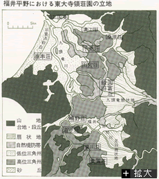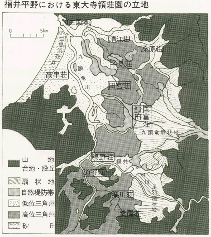 福井平野に位置する東大寺領の各荘園は、扇状地の扇端部以下に広がる白然堤防帯に立地することが多い。この部分は、微高地(自然堤防)と低湿地(後背湿地)が交錯し、耕地は水田として条件の良い後背湿地を中心に開墾された。開発が早くから進んだ近江国などでは、同様の条件の土地はすでに一時代前に耕地化していた。