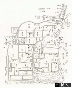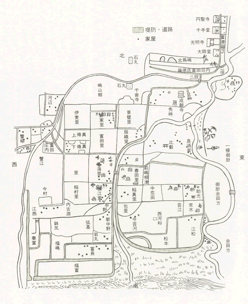 尾張国円覚寺領富田荘は、現在の名古屋市中川区富田町付近にあった。嘉暦2(1327)年作成とされる絵図には、方格地割がみられるが、これは古代の荒廃水田が再開発されたときのものであろうとされている。自然堤防上に集落を立地させて分流する庄内川など三つの河川は、洪水で荒廃をもたらすとともに、旺盛な堆積作用で干拓による農地開発を可能にした。絵図の南側には干潟らしいようすが描かれている。(円覚寺蔵)