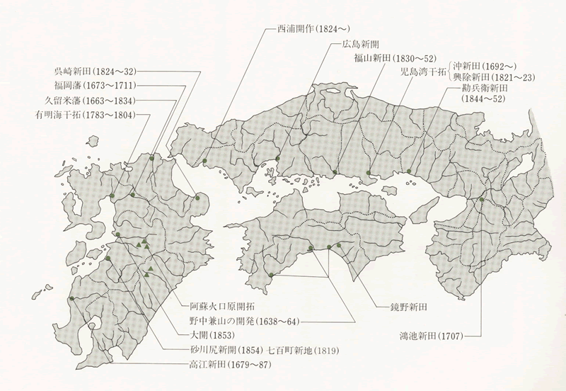 新田開発は、東日本では、山林原野の開墾と河川流域に分布する湖沼・低湿地の干拓といった内陸部の開発を主としていた。西日本においては、干潟の干拓、すなわち海岸部の開発が主として行われた。もはや陸域にほとんど適当な未墾地が残されておらず、必然的に陸地に続く浅海域を対象としたのであった。しかも西日本では開発のピークは比較的初期にあり、江戸中期には限界に近づいていたのに対し、東日本では幕末期に最隆盛期を迎えるという時期的な差もあった。これは比較的長大な河川とその流域の広い平野が近世に至るまで未墾地として残されざるを得なかった、自然的かつ歴史的な条件の差であった。
