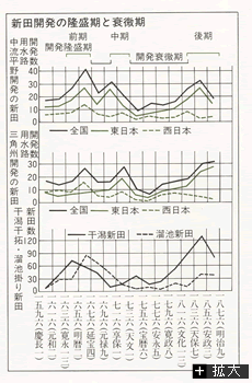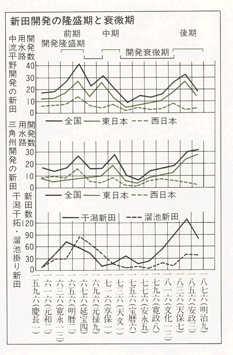 新田開発が進められたのは、幕藩体制の制度的整備が確立する明暦~寛文期(1660年ごろ)、幕府財政の再建を図り改革の行われた享保期(1720年ごろ)、深刻化する幕藩体制の危機に直面し改革の行われた幕末に近い天保~安政期(1840年ごろ)の3期をピークとしている。いずれも、体制の確立や強化を背景にした開発奨励や農業振興によっている。