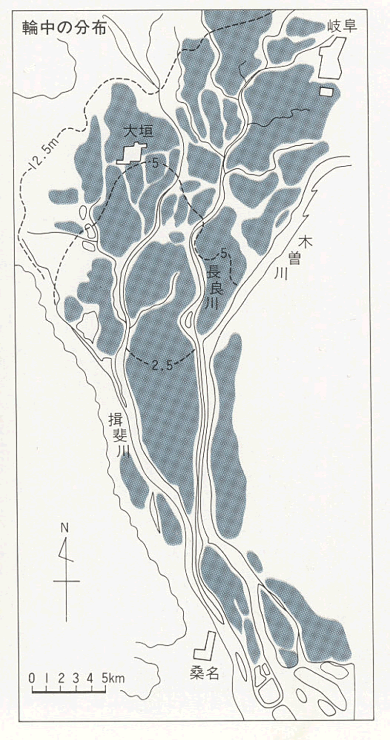 輪中は、水害から守るため、集落や耕地の周囲を堤防で囲んだところをいい、この堤防を輪中堤という。濃尾平野では木曽川河口からほぼ45kmの内陸にある岐阜市から伊勢湾まで大小45の輪中が連なっている。 当初、堤防は集落・耕地の上流側にあたる部分に造成され、濁流の激突をかわすことに努めた。こうした堤防は、下流からの浸水にはまったく無防備であったが、耕地は冠水しても土砂による埋没・荒廃は免れ、反面、肥沃な土壌が堆積して地力はむしろ年々更新されていった。