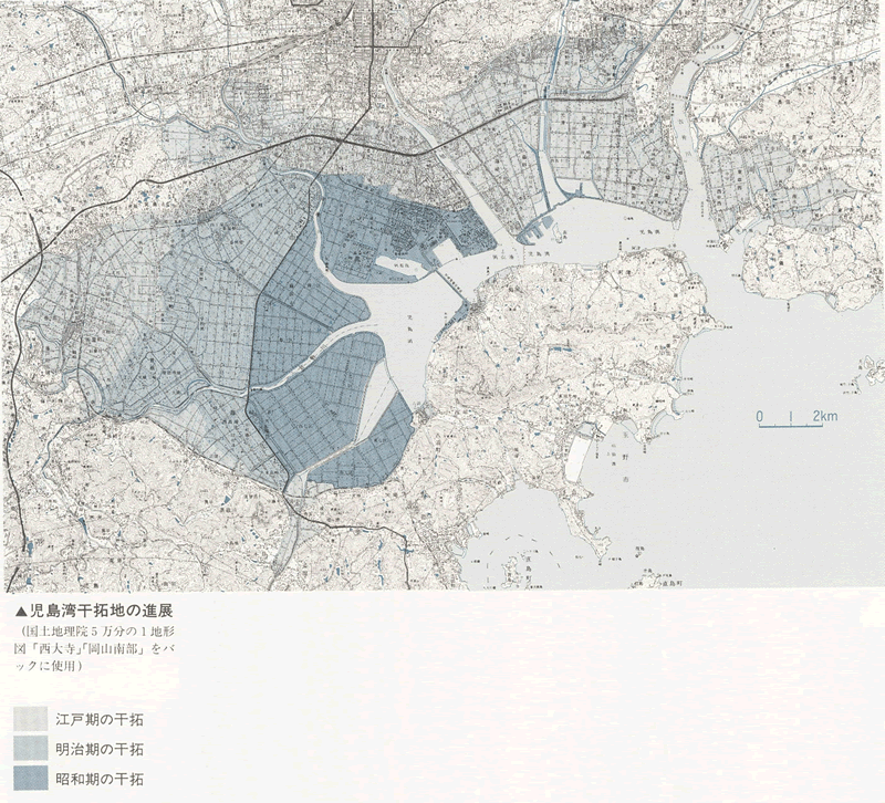 西日本の大きな沖積平野は、河川が湾を埋め立てて干潟を形成し、その前進によって発達した平野である。瀬戸内海沿岸には、近世以後干拓の前進によって新田開発を進めたところが多い。こうした干拓地は、平坦で広がりが大きいため、用排水路などの基幹施設が整備されるにしたがい、大規模で高い生産力をもつ稲作地帯となった。広島市の太田川河口三角州や山口県の開作とよばれる多くの干拓地のほか、典型的な発展をとげたところに岡山県の児島湾がある。