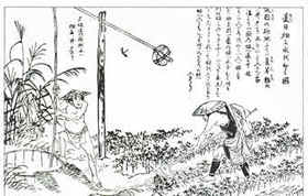 井戸水の汲み上げによく利用されたもので、挺子の原理を用いている。畿内の綿作地でよく使われた。(『農具便利論』より)