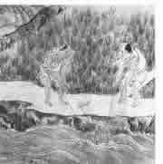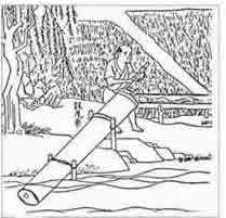 竜骨板という水かき板をつないだものを足踏み労力で回して,樋の中の水を押し上げる。(会津若松市蔵『会津農耕春秋」より)