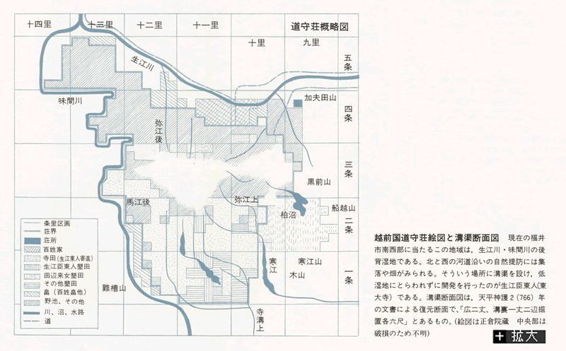 荘園の範囲の確定や境界の明確化の目的で多く作成された荘園絵図においても、溜池や井堰が図中の重要な事物として描かれていることが多い。越前国足羽郡道守荘(福井県)は、足羽川(旧生江川)と日野川(旧味間川)の合流点付近に位置し、河道沿いの自然堤防に囲まれた一連の後背湿地に立地している。8世紀中ごろ、それまで南東部に散在する沼沢のほとりで小規模な開発しか行われていなかったこの地域で、足羽郡大領(郡司)の生江臣東人が本格的な開発を行い、墾田を東大寺に寄進した。その際、寒江に流入する長さ1721丈(約6.3km)におよぶ溝と3本に分岐する寺溝を開削し、これらが絵図に示されている。前者は生江川から取水するもので、5本のサイフォン(度樋)によって他の溝と交叉していたこと、堤防(土掘置)を備え、耕地をも潰して(潰れ地は応損田という)新設したことなどが明らかである。管理のためには水守がいて、用水の獲得に意を用いていた。
