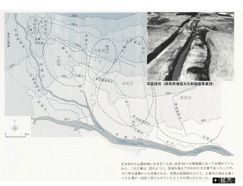 赤城山の南麓(群馬県)に女堀という全長約12km幅15~20m、深さ3~4mにおよぶ巨大な用水の遺構がある。この用水は旧利根川(現桃木川)から取水し、12世紀中ごろ扇状地に成立した上野国淵名荘の開発を目的に開削されたとされている。渡良瀬川が形成した大間々扇状地は、火山性山麓に特有な用水不足のところであるが、それでも開析谷に細々と谷地田が開発された。女堀は、その限られた水田開発の進行に伴う用水不足を解消するため、荘域を越え扇状地を横断して行われた国衙レベルの大工事であるが未完成に終わった。