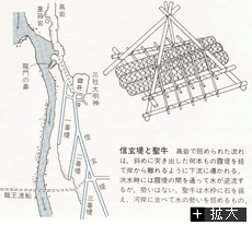 「信玄堤」は下流に下るとともに川から離れ、平常流路との間に流作場をつくる。この流作場は、洪水時の逆流を導く遊水地ではあったが、不安定ながら耕作もできた。江戸期以降、堤防の整備と流路の閉じ込めに伴い安定化していった。また水勢をそぐ聖牛という木枠を設置した。堤の日常管理のため祠を祀り、群集に踏み固めさせたといわれるが堤への人々の注目を期待したからでもあろう。