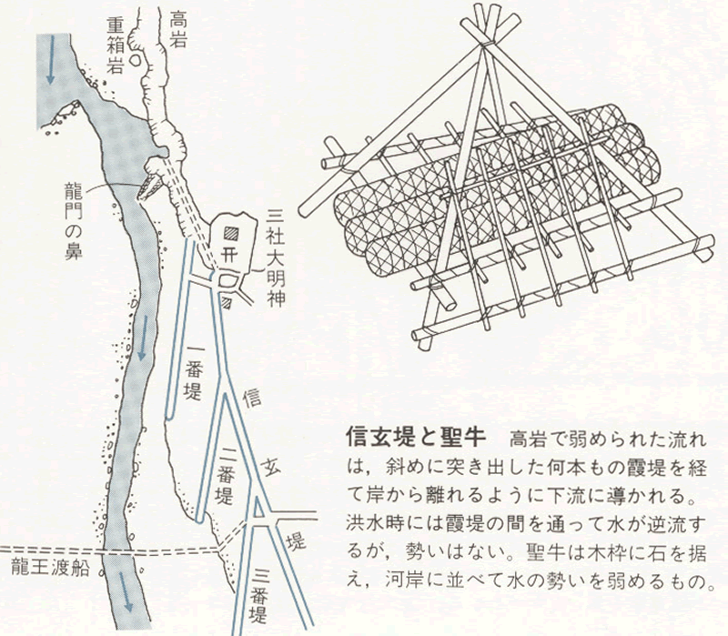 盆地への出ロに5本の頑強な「石積み出し」を設けて川を北流させ、将棋の駒形の堤防「将棋頭」で流れを二分して水勢をそいだのち、岩石崖に流れをぶつけて釜無川と合流させた。