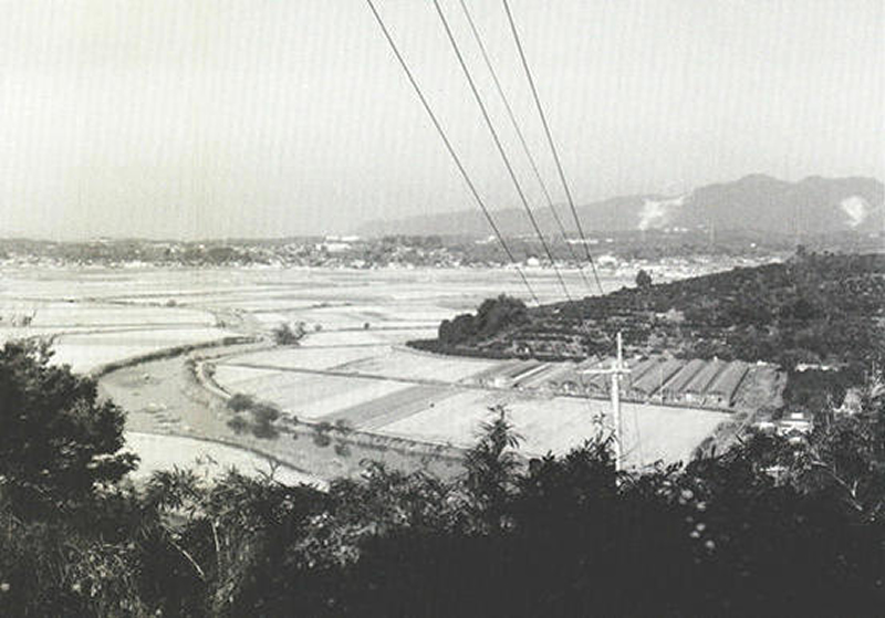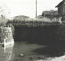 天正17(1589)年~慶長10(1605)年の菊池川の瀬替えによってつくり出された干拓地が小田牟田新地(下)。旧菊池川と唐人川との合流点付近の横島と久島の問には、潮流の逆流からこの新地を守るために石塔が築かれ、横島井樋によって、内水を排除した。下の写真右手前の家が建っている所が石垢で、手前を流れる河川の出ロに横島井樋があるロ