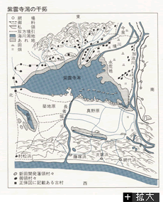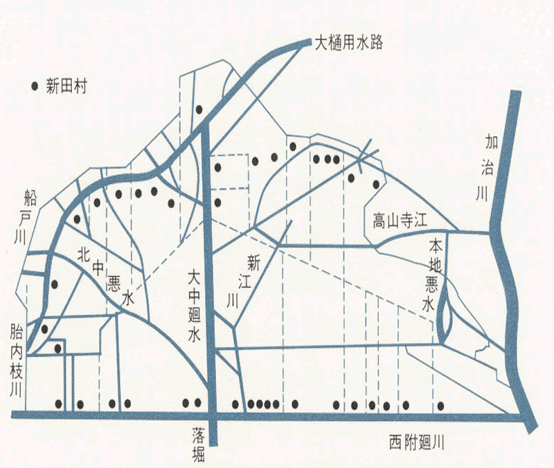 加治川の遊水池であった紫雲寺潟の干拓は,加治川と紫雲寺潟を結ぶ境川を締切り,干拓地内の排水を日本海へ落とす長者堀を掘削することで行われた。干拓地の周囲には,西付廻川・東付廻川などの廻し堀が設けられ,周辺の古村からの排水を受けるとともに,用水を新田内に分配する。この廻し堀の用水源は,加治川をはじめとする河川であり,大樋用水路や高山寺江により導水した。溜井を用水源とした関東流の椿海干拓と大きく異なる紀州流干拓の特徴である。