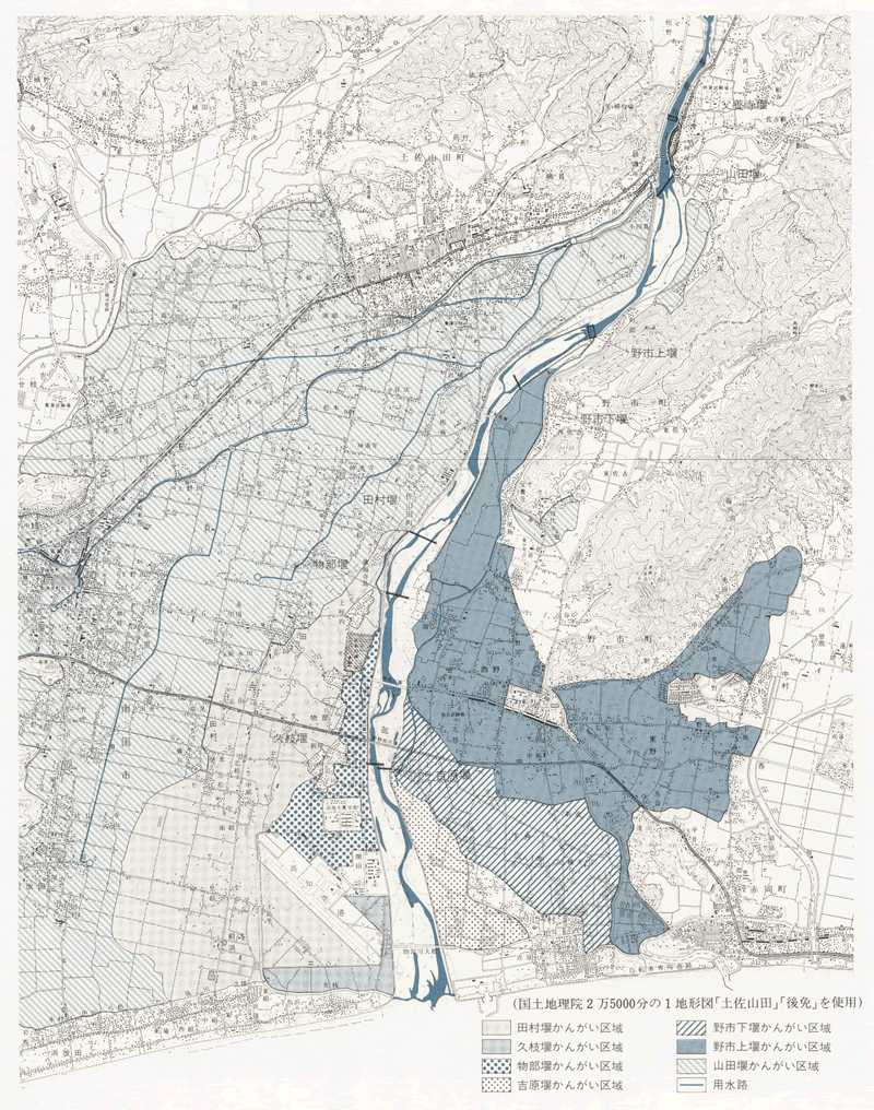 これらの用水路によって開発された水田は、「堰下3万石」ともいわれた。それだけでなく、舟入川水路は、下流の大津川と連絡されることにより、新しい水上交通路となり、山間部と城下を結ぶ物資交流のうえで大きな意義をもった。台地上には郷士屋敷が散村状に分布するが、水路を核として新たに後免・土佐山田など在郷町も建設された。商人らの誘致に際し、諸役を免除したところから「御(後)免」の名がある。