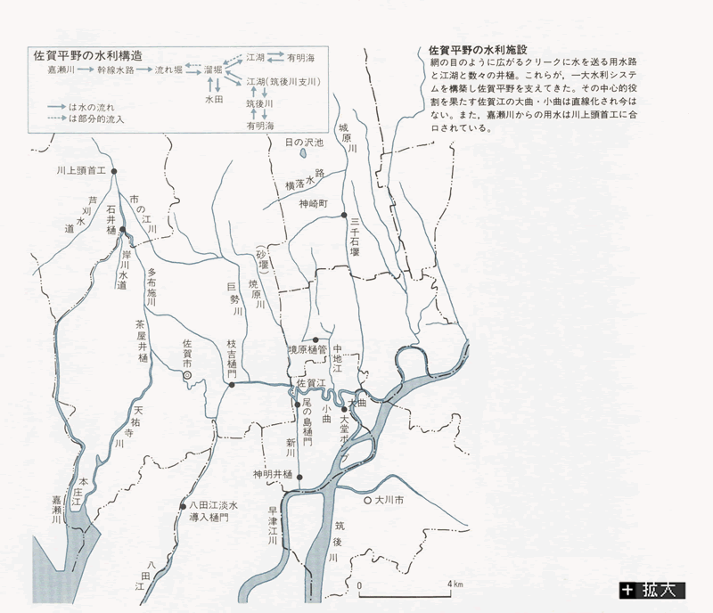 また、佐賀城下の洪水対策として、城下を取り巻く河川堤防の対岸側を低くした。このほか筑後川沿いに築いた千栗土居や、高潮から干拓地を守るために有明海沿岸に設けた五千間土居などの治水の業績も数多く、今なおその遺構が各所で見うけられる。こうして、平野に広がるクリーク網を中心に、江湖と河川が有機的に結びつき、平野全体で水を導き、貯留し、配分し、排除するこの地方独特の水利用の仕組みができあがったのである。
