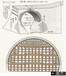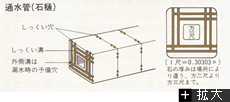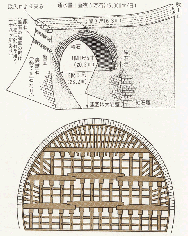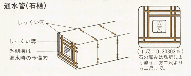 通水管は、強大な水圧に耐えられるよう、良質の石材を柾目に採り、中央に30㎝角の通水孔を掘ってブロックにしたものを連結した。その結合部からの漏水を防ぐため、石の面に溝を切り、そこに土・砂・貝灰・塩・松葉汁などを混ぜた特殊な漆喰を入れて固めている。