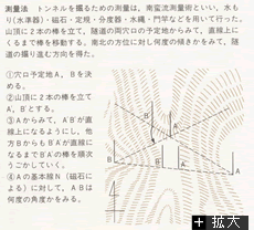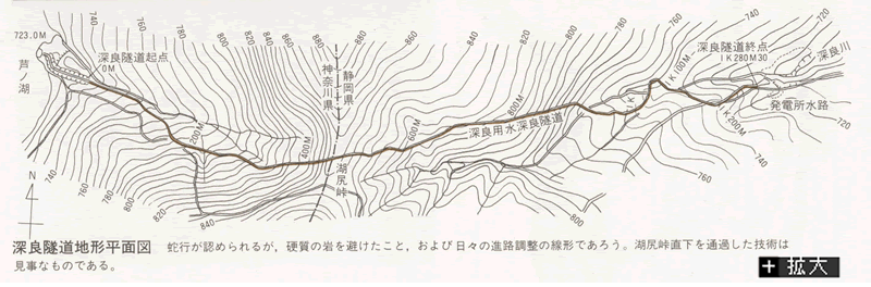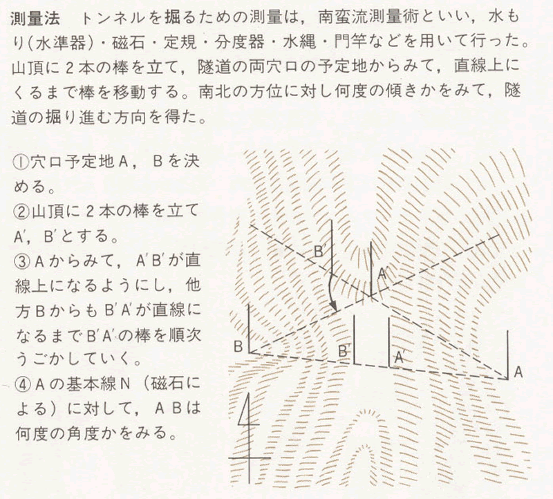 掘進方向は、行灯を利用し、日々掘削地点で確認したようである。掘削器具は、当時の鉱山採鉱で利用されていた、つるはし・のみが主体であり、凝灰岩主体の地質のなかで断層・破砕帯・崩落・湧水に悩まされながらの工事であった。平面的にみれば路線は蛇行しているが、硬い岩を避けながらの掘進であったためでもあろうし、誤差修正を行いながらの掘進であったためでもあろう。トンネルでは中央部の落差のほか、両方の坑口から150mほどの位置に設定されている換気用とみられる立坑が目を引く。