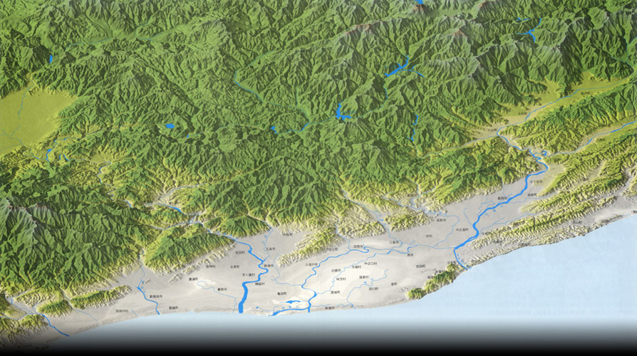The current map shown here is a computer graphics generated by analyzing precise geographical data about latitude, longitude, elevation, etc. and applying multi-layering techniques. In short, it shows a view of the reproduction of the real land without buildings, houses and other structures. We first notice that there is surprisingly little difference between the current terrain and the one in the year-1089 map. Accordingly, it is not surprising to see that the zone of sandy soil on today’s map may all have been part of the ocean in earlier times.