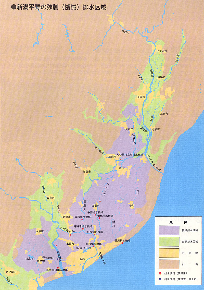 In other words, these pump stations which farmers have provided exert tremendous force to drain the area 24 hours a day and barely to manage to protect Niigata Plain from being inundated.