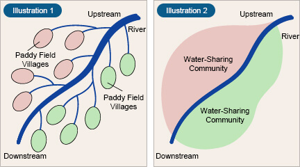 Rice paddy communities can subsist with the condition that people can draw enormous amounts of water from rivers.
